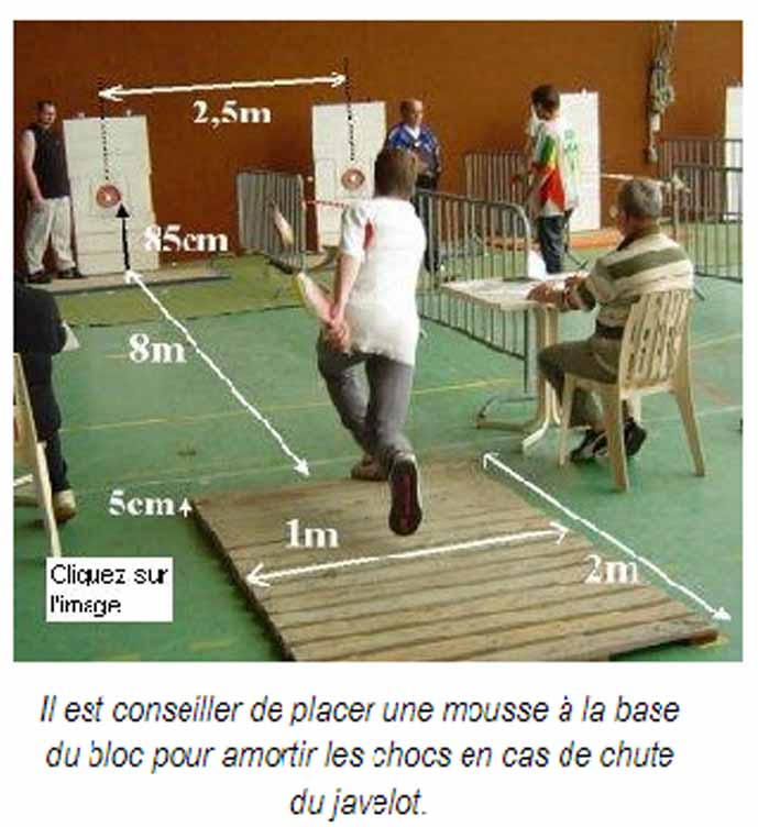 Le javelot est lancé à partir d'un plancher d'au minimum 2 m de long, 1m de large, et 5 cm d'épaisseur, destiné à éviter les litiges de pas dans une cible en planches.